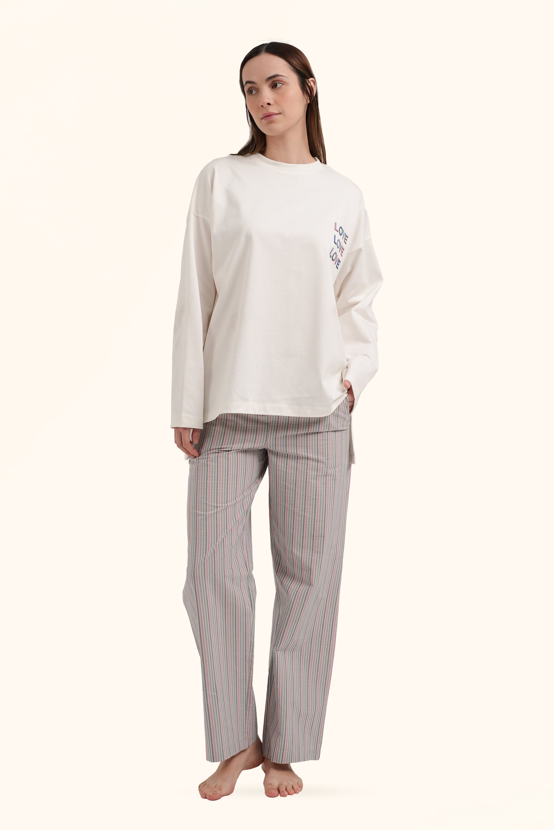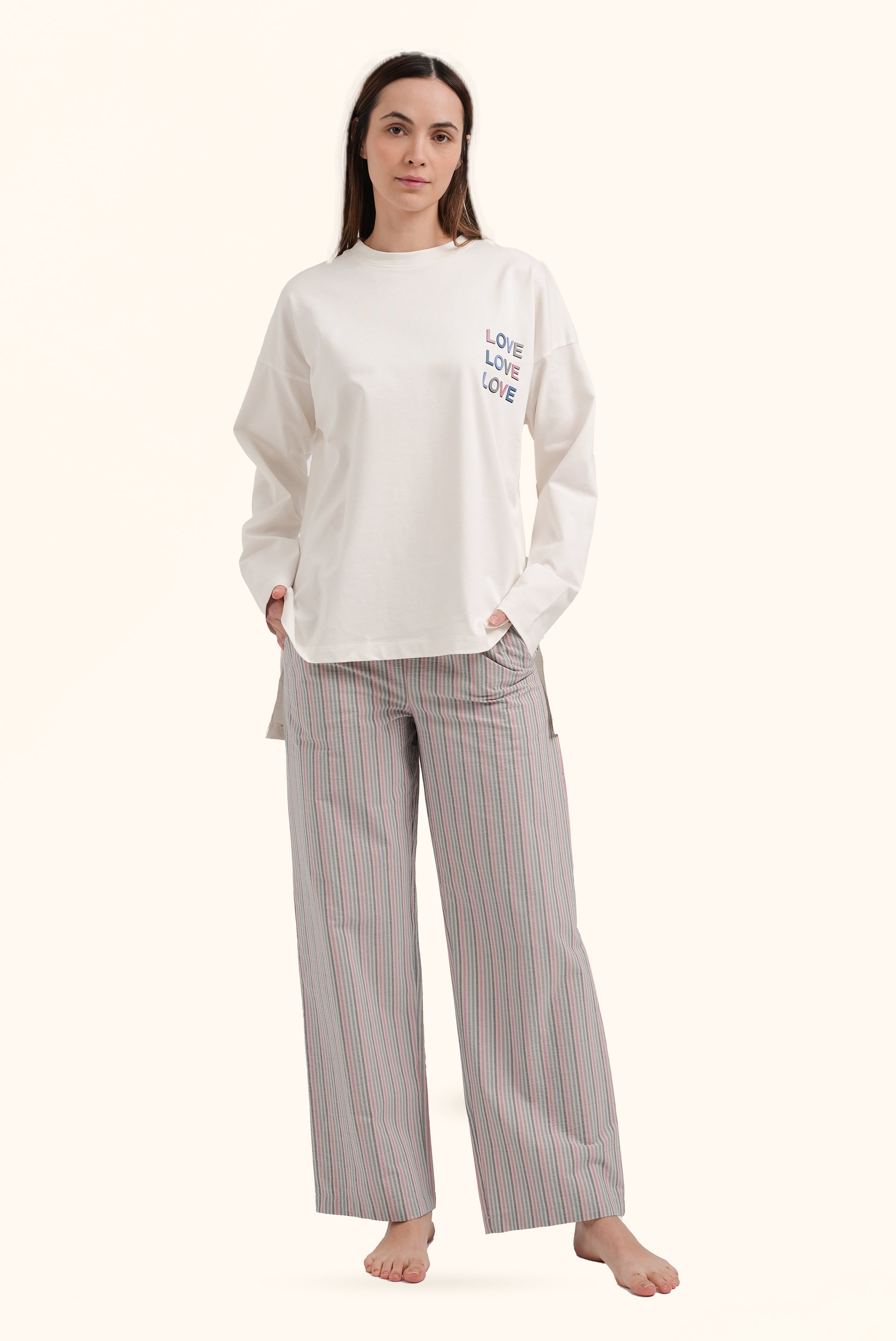 Embrace bold comfort with our heavy cotton long sleeve T-shirt, featuring a striking printed "LOVE" design. Paired with multicoloured, pastel-striped pants, this set brings a playful yet expressive twist to everyday style.